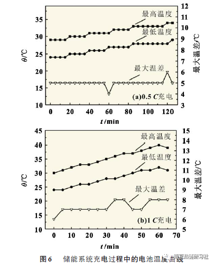 研究結(jié)果表明,采用設(shè)計(jì)的熱管理系統(tǒng)及溫控策略,可以保證儲(chǔ)能系統(tǒng)0.5C充電運(yùn)行時(shí),電池最高溫度不高于34℃,儲(chǔ)能系統(tǒng)最大溫差基本保持在5℃,說(shuō)明儲(chǔ)能系統(tǒng)低倍率運(yùn)行時(shí),可以保證電池工作在最佳溫度范圍內(nèi)。儲(chǔ)能系統(tǒng)1C充電運(yùn)行時(shí),電池最高溫度不超過(guò)40℃,儲(chǔ)能系統(tǒng)最大溫差8℃以內(nèi),熱管理效果良好。
