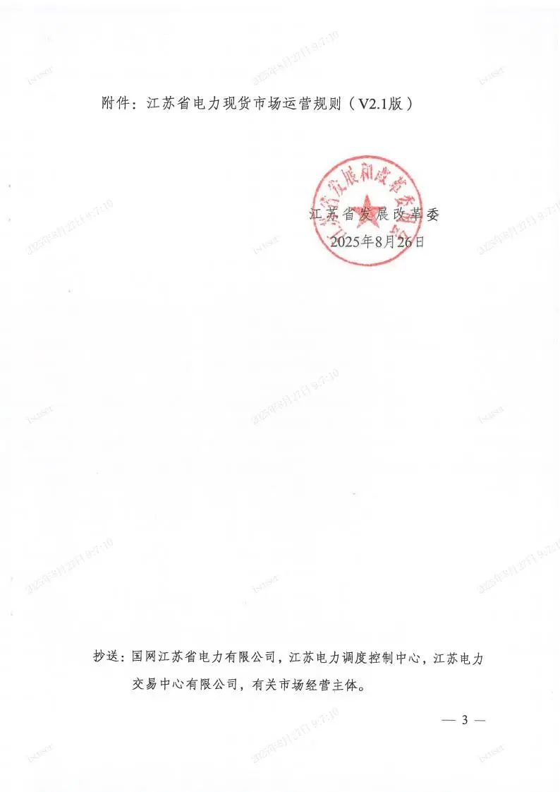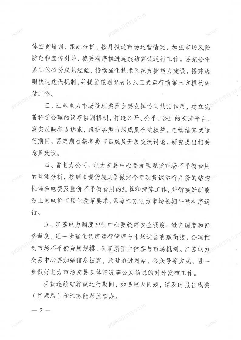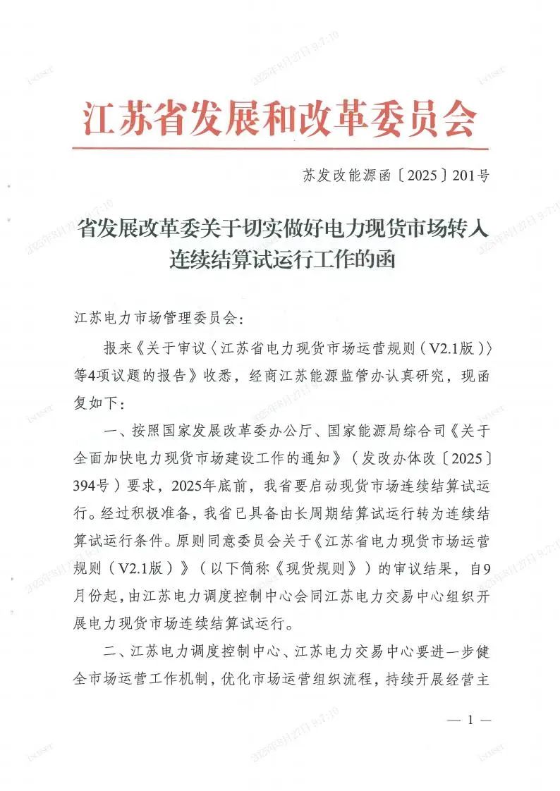 8月22日,江蘇電力市場管理委員會審議表決通過《江蘇省電力現(xiàn)貨市場運(yùn)營規(guī)則(V2.1版)》。會后,江蘇電力市場管理委員會按要求將《關(guān)于審議<江蘇省電力現(xiàn)貨市場運(yùn)營規(guī)則(V2.1版)>等4項(xiàng)議題的報(bào)告》呈報(bào)至江蘇省能源局、江蘇能源監(jiān)管辦。8月26日,委員會收到《省發(fā)展改革委關(guān)于切實(shí)做好電力現(xiàn)貨市場轉(zhuǎn)入連續(xù)結(jié)算試運(yùn)行工作的函》(詳見附件)。特此通知。