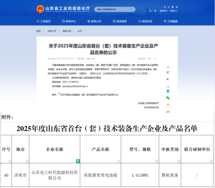中國儲(chǔ)能網(wǎng)訊:近日,山東省工業(yè)和信息化廳發(fā)布2025年度山東省首臺(tái)(套)技術(shù)裝備生產(chǎn)企業(yè)及產(chǎn)品名單,中電裝儲(chǔ)能所屬山東電工時(shí)代5.015MWh高能量密度電池艙成功入選首臺(tái)(套)整機(jī)裝備名單。該成果標(biāo)志著中電裝儲(chǔ)能在儲(chǔ)能技術(shù)創(chuàng)新、高端制造、產(chǎn)業(yè)化應(yīng)用等方面取得重大突破,將進(jìn)一步推動(dòng)公司儲(chǔ)能業(yè)務(wù)的創(chuàng)新發(fā)展,為儲(chǔ)能產(chǎn)業(yè)高質(zhì)量發(fā)展注入新的動(dòng)力。