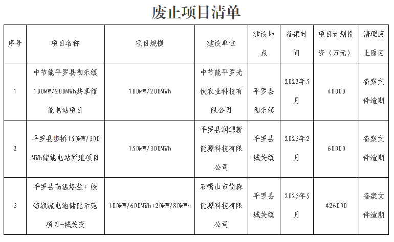 石嘴山市平羅縣審批服務管理局關于廢止一批新型儲能項目的公告