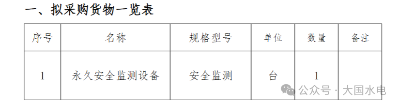 因中國水利水電第三工程局有限公司第五工程公司重慶栗子灣抽水蓄能電站Q2標項目部需要,我司擬采用競價采購(公開詢比價)采購方式進行永久安全監(jiān)測設備的采購,本次采購物資計劃使用自籌資金用于本次競價采購(公開詢比價)后所簽訂合同的支付。