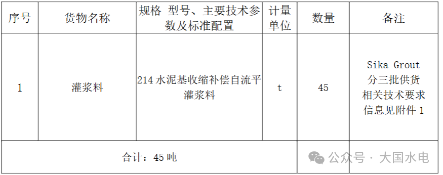 因中國電建水電十四局廣東中洞抽水蓄能電站機電安裝項目部灌漿料采購項目需要,我單位擬采用競價采購(公開詢比價)方式進行下列貨物的批量采購,請按以下要求于 2025 年 09 月 05 日 16 時 00 分前將報價文件提交至中國電建集中采購平臺。
