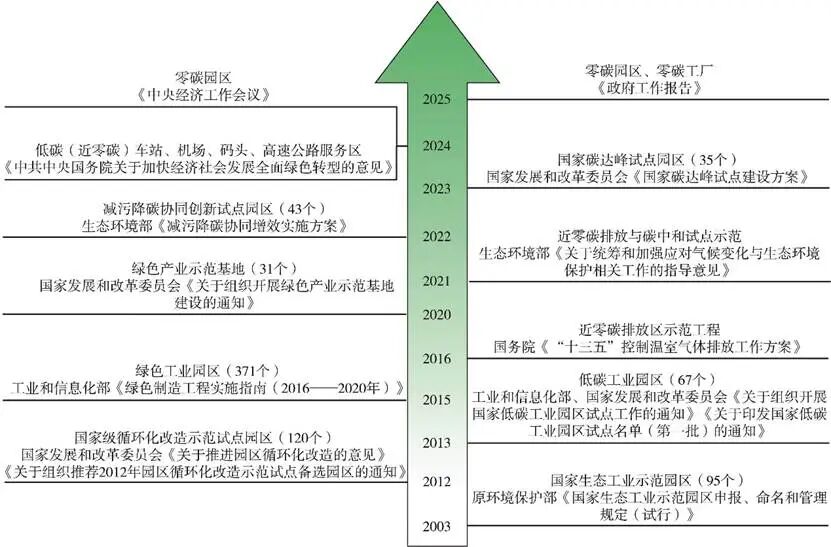 在政策層面,園區(qū)零碳發(fā)展政策經(jīng)歷了從“早期探索—孕育發(fā)展—全面深化”的階段性演進(jìn)過程(圖1)。在早期探索階段,國(guó)家相關(guān)部委主要從某個(gè)角度或者領(lǐng)域出發(fā),先后推進(jìn)生態(tài)工業(yè)示范園區(qū)、循環(huán)化改造示范園區(qū)、低碳工業(yè)園區(qū)、綠色工業(yè)園區(qū)和綠色產(chǎn)業(yè)示范基地等多類試點(diǎn)項(xiàng)目。其中,生態(tài)工業(yè)園區(qū)與循環(huán)化改造園區(qū)以循環(huán)經(jīng)濟(jì)理念推動(dòng)產(chǎn)業(yè)鏈綠色改造,低碳工業(yè)園區(qū)聚焦重點(diǎn)用能行業(yè)的低碳轉(zhuǎn)型,而綠色工業(yè)園區(qū)和綠色產(chǎn)業(yè)示范基地則突出綠色制造理念。這些試點(diǎn)在生態(tài)保護(hù)、資源循環(huán)利用、低碳轉(zhuǎn)型、綠色制造等方面積累了經(jīng)驗(yàn),為后續(xù)推進(jìn)系統(tǒng)性治理奠定了重要基礎(chǔ)。