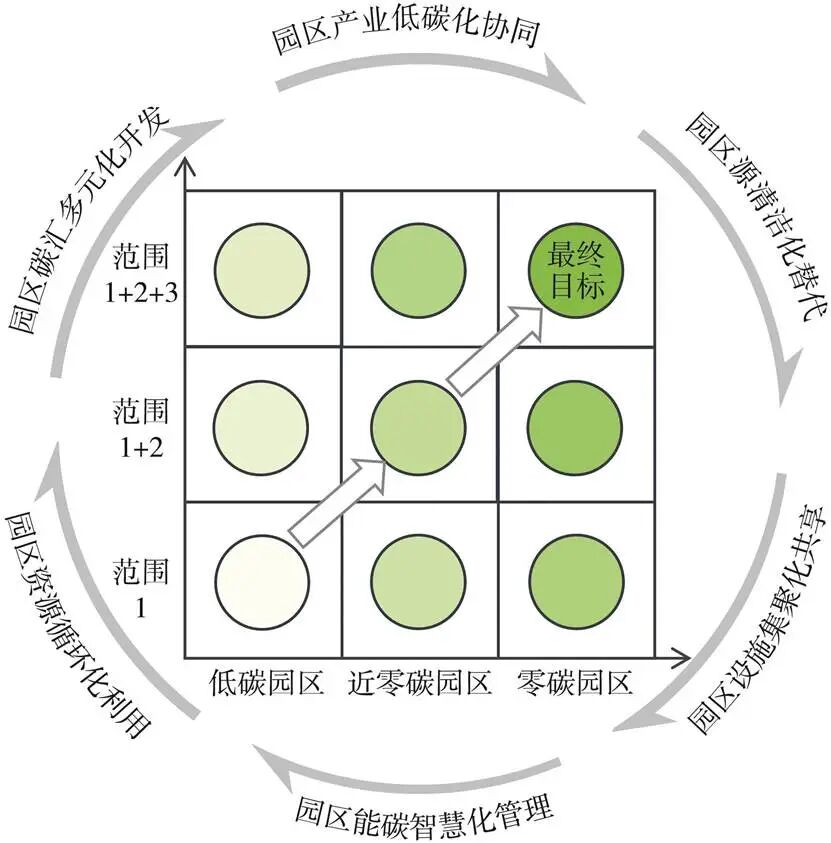 零碳園區(qū)建設(shè)通常經(jīng)歷三個(gè)階段:低碳園區(qū)、近零碳園區(qū)和零碳園區(qū)。低碳園區(qū)是碳減排的初始階段,通過建立循環(huán)經(jīng)濟(jì)模式,提升園區(qū)內(nèi)資源利用效率,減少?gòu)U物排放,構(gòu)建“低碳、清潔、和諧”的產(chǎn)業(yè)環(huán)境,其目標(biāo)是盡可能降低碳排放但并不追求零排放。近零碳園區(qū)是碳減排的過渡階段,其在低碳園區(qū)的基礎(chǔ)上進(jìn)一步引入多領(lǐng)域的低碳技術(shù)和管理創(chuàng)新,逐步實(shí)現(xiàn)“碳源”與“碳匯”的平衡。其能源需求更多依賴于接近零碳的能源供給,建筑和交通通過智能低碳技術(shù)降低排放。零碳園區(qū)則是碳減排的最終階段,目標(biāo)是在一定期限內(nèi),通過技術(shù)手段和管理措施,抵消所有直接或間接產(chǎn)生的碳排放,實(shí)現(xiàn)凈零排放。零碳園區(qū)不僅應(yīng)用廣泛的低碳負(fù)碳技術(shù),還強(qiáng)調(diào)碳補(bǔ)償和碳匯,推動(dòng)產(chǎn)業(yè)、能源、建筑和交通等領(lǐng)域的零碳化,是“雙碳”背景下園區(qū)演進(jìn)的最終目標(biāo)形態(tài)。