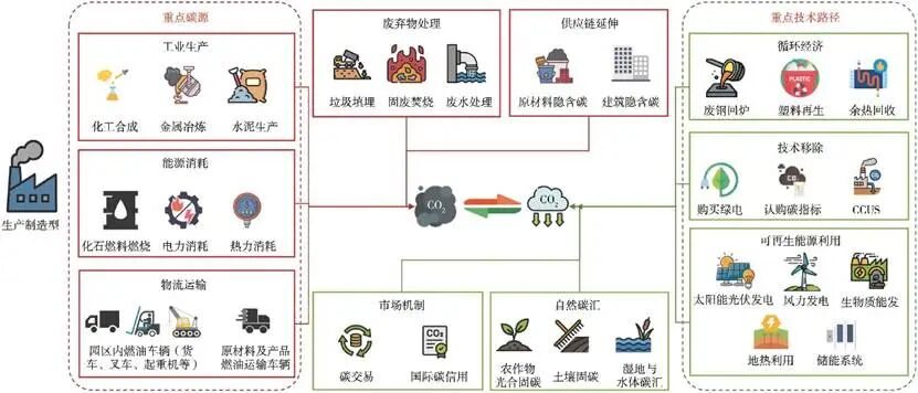 生產(chǎn)制造型園區(qū)通常以高耗能制造業(yè)為主導(dǎo),園區(qū)內(nèi)多為工廠廠房和生產(chǎn)設(shè)施。如圖3所示,其碳排放主要來自工業(yè)生產(chǎn)環(huán)節(jié)(如化工合成、金屬冶煉、水泥生產(chǎn)等,范圍1)、能源消耗環(huán)節(jié)(如煤炭、天然氣等燃料燃燒和電力、熱力使用,范圍1和2),以及物流運(yùn)輸環(huán)節(jié)(如園區(qū)外燃油運(yùn)輸車輛等,范圍3)。此類園區(qū)應(yīng)聚焦如下降碳路徑:在物質(zhì)流方面,推廣廢鋼回爐、塑料再生、余熱回收等閉環(huán)工藝,降低原生資源依賴,推動(dòng)資源循環(huán)利用。能源側(cè)推動(dòng)太陽能光伏、風(fēng)能、生物質(zhì)和地?zé)岬瓤稍偕茉刺娲鷤鹘y(tǒng)化石燃料,并配套構(gòu)建多能源融合系統(tǒng),以兼顧能源結(jié)構(gòu)優(yōu)化和設(shè)備集成共享。對(duì)于其他技術(shù)手段仍難以消除的剩余排放,可以通過購(gòu)買綠電、認(rèn)購(gòu)碳指標(biāo)、探索CCUS等方式消除。