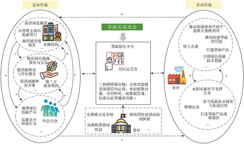 右側(cè)的理念實(shí)現(xiàn)市場(chǎng)由鏈主企業(yè)與鏈輔企業(yè)構(gòu)成。鏈主企業(yè)具備資源集聚與系統(tǒng)轉(zhuǎn)型能力,是園區(qū)綠色低碳能源替代、低碳制造升級(jí)與綠色供應(yīng)鏈重塑的主導(dǎo)力量,其回報(bào)體現(xiàn)為政策激勵(lì)、市場(chǎng)占有率提升與品牌聲譽(yù)增強(qiáng)。鏈輔企業(yè)則在零碳技術(shù)研發(fā)、零碳產(chǎn)品(零部件)供給和專業(yè)化配套方面發(fā)揮靈活性優(yōu)勢(shì),增強(qiáng)園區(qū)綠色供給的多樣性與適應(yīng)性,進(jìn)而獲得技術(shù)溢出效應(yīng)與新興市場(chǎng)空間。在企業(yè)間協(xié)作方面,鏈主企業(yè)通過共建產(chǎn)業(yè)聯(lián)盟、聯(lián)合技術(shù)攻關(guān)形成協(xié)同引領(lǐng)格局;鏈輔企業(yè)之間則通過共享設(shè)施、互補(bǔ)技術(shù)與聯(lián)合采購(gòu)提升資源配置效率;鏈主企業(yè)與鏈輔企業(yè)之間通過標(biāo)準(zhǔn)聯(lián)動(dòng)與產(chǎn)業(yè)鏈協(xié)同推動(dòng)減排責(zé)任共擔(dān)與創(chuàng)新成果轉(zhuǎn)化,最終構(gòu)建出一個(gè)互嵌互動(dòng)、共生共贏的零碳產(chǎn)業(yè)生態(tài)網(wǎng)絡(luò)。