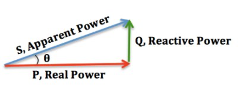 功率三角形,顯示了有功功率、視在功率和無功功率之間的關系。(來源:維基百科[1])