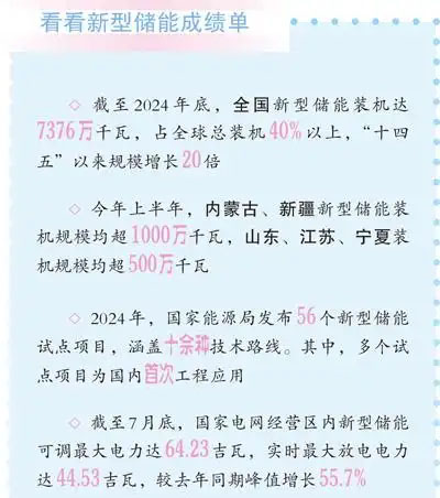 國家能源局近日發(fā)布的《中國新型儲能發(fā)展報告(2025)》(以下簡稱《報告》)顯示,截至2024年底,全國已建成投運新型儲能7376萬千瓦/1.68億千瓦時,裝機規(guī)模占全球總裝機比例超過40%。中國新型儲能規(guī)模已躍居世界第一。