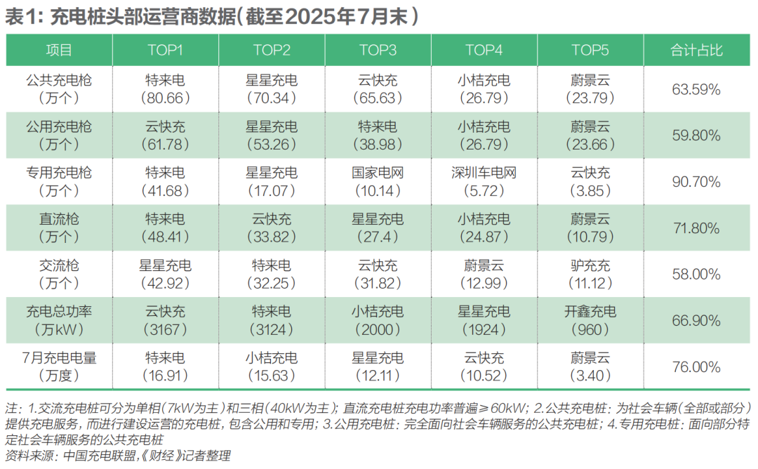 而充電站市場,根據(jù)國家能源局?jǐn)?shù)據(jù),規(guī)模以上的充電運(yùn)營服務(wù)商中,民營企業(yè)占比超過80%。根據(jù)充電聯(lián)盟的數(shù)據(jù),截至2025年7月,公共充電設(shè)施運(yùn)營商的前五名分別是特來電、星星充電、小桔、云快充、蔚景云,均為民營企業(yè)。