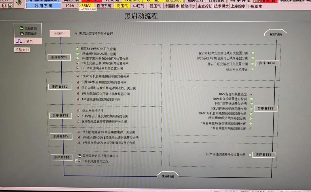 主要針對原有的廠用電系統(tǒng)中舊式的開關(guān)增加監(jiān)控接點,包括多次試驗10kV系統(tǒng)和400V系統(tǒng)中相關(guān)開關(guān)的動作邏輯,并優(yōu)化動作時間和順序。并將桐柏電站黑啟動主邏輯下載至LCU5公共設(shè)備現(xiàn)地控制單元,更新升級1號機現(xiàn)地控制單元以及開關(guān)站設(shè)備現(xiàn)地控制單元,以此來實現(xiàn)上位機發(fā)令,現(xiàn)地控制單元執(zhí)行相關(guān)命令,最終達到成功黑啟動的目的。