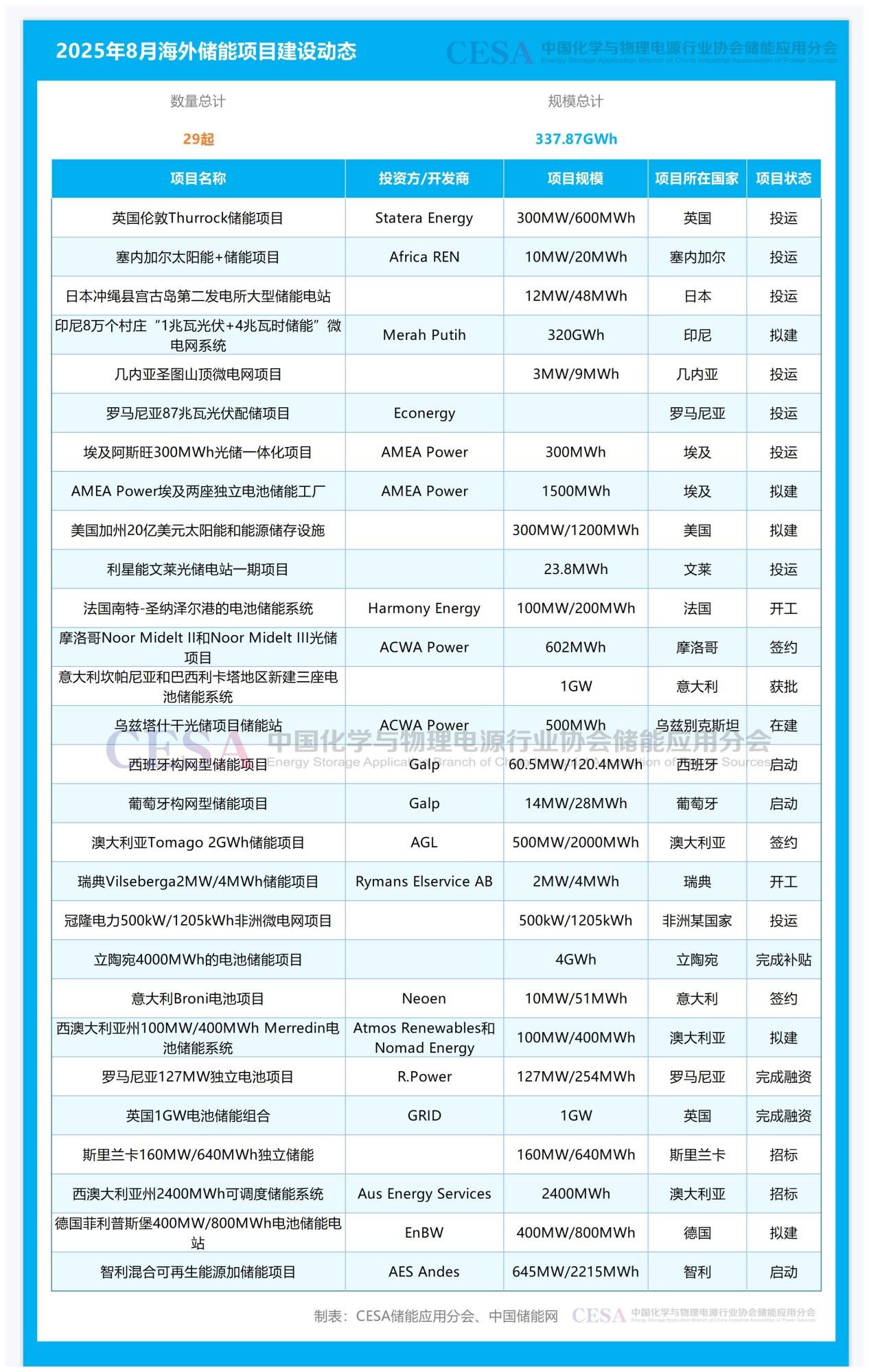 中國儲能網(wǎng)訊:2025年8月,CESA儲能應(yīng)用分會產(chǎn)業(yè)數(shù)據(jù)庫追蹤到29起海外儲能項目建設(shè)動態(tài)事件,總規(guī)模為337.87GWh,涉及Statera Energy、Africa REN、Merah Putih、Econergy、AMEA Power、Harmony Energy、ACWA Power、Galp、AGL、Rymans Elservice AB等全球能源投資方/開發(fā)商,建設(shè)地點(diǎn)位于英國、塞內(nèi)加爾、日本、印尼、幾內(nèi)亞、埃及、美國、摩洛哥、烏茲別克斯坦、西班牙、葡萄牙、澳大利亞等國家。