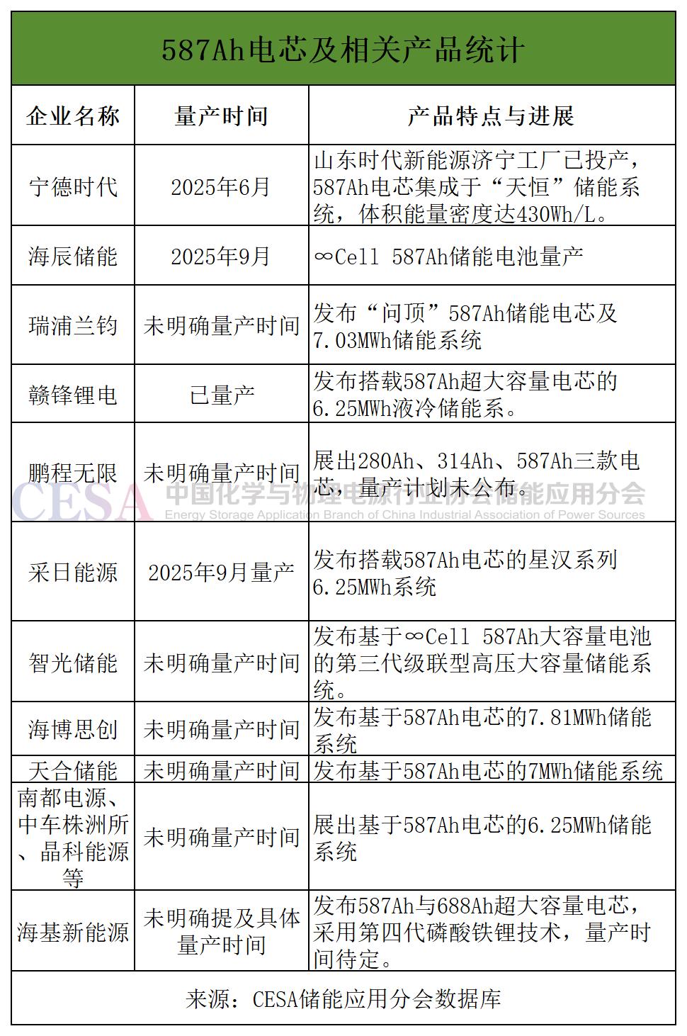 下半年以來,587Ah 電芯的主流化趨勢明顯加快,呈現(xiàn)出 "頭部引領、產業(yè)鏈跟進"的趨勢,10余家企業(yè)發(fā)布587Ah電芯或搭載該電芯的系統(tǒng)產品。