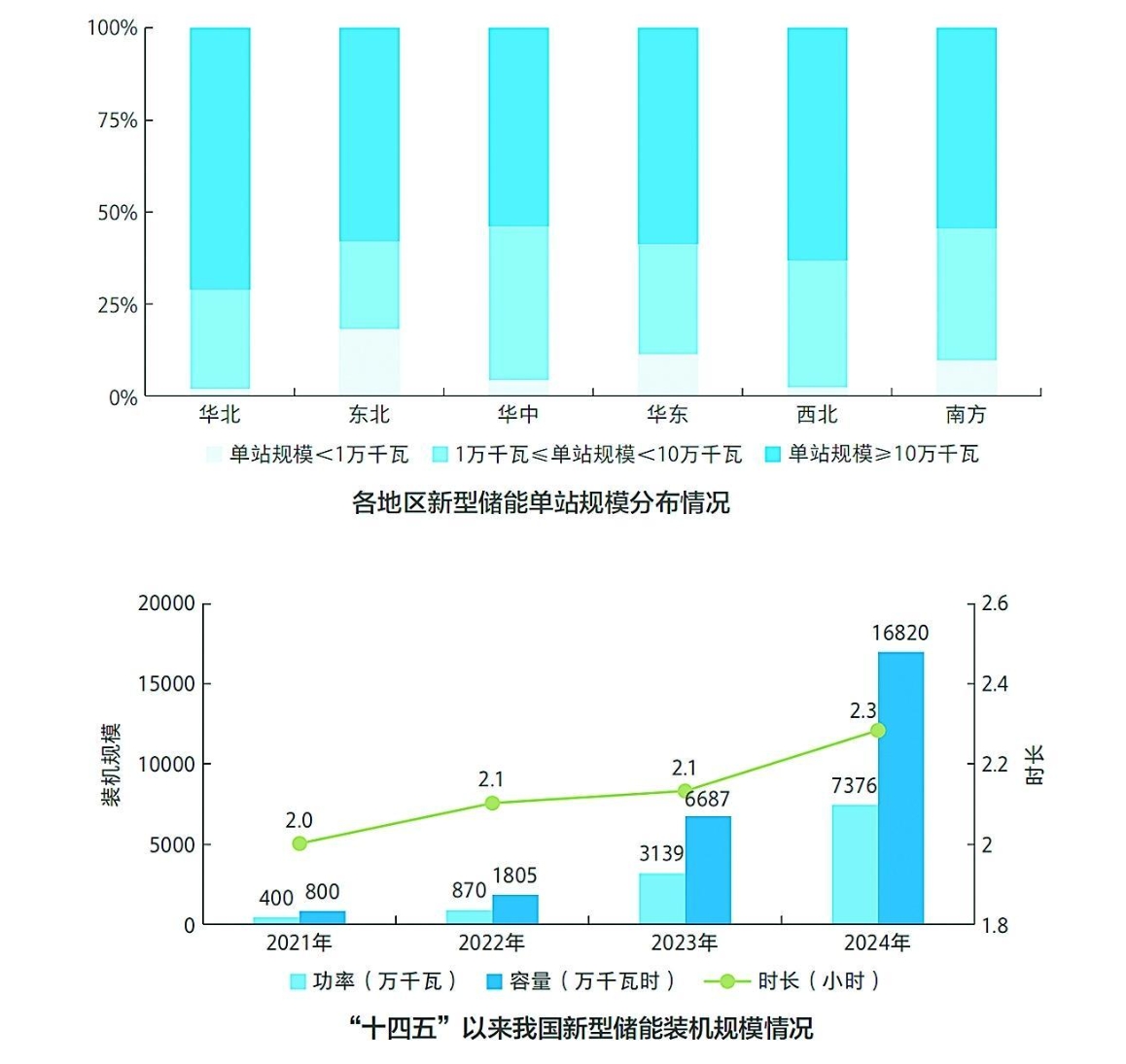 新型儲能裝機(jī)規(guī)模連年翻番。截至2024年底,全國已建成投運新型儲能項目累計裝機(jī)規(guī)模達(dá)7376萬千瓦/1.68億千瓦時,約為“十三五”末的20倍,較2023年底增長超過130%,2024年新增新型儲能裝機(jī)4237萬千瓦/1.01億千瓦時。全國新型儲能平均儲能時長2.3小時,較2023年底增加約0.2小時,“十四五”以來儲能時長呈上升趨勢。