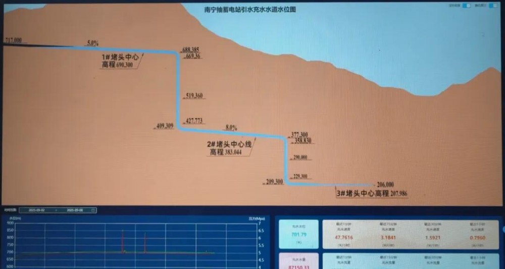 本次引水水道充水實(shí)現(xiàn)“三個首次”:首次在上水庫尚未蓄水的環(huán)境下開展引水水道充水;首次采用專屬流道充水系統(tǒng)設(shè)備進(jìn)行充水試驗;首次通過計算機(jī)監(jiān)控系統(tǒng)對流道充水系統(tǒng)設(shè)備關(guān)鍵運(yùn)行參數(shù)全過程實(shí)時監(jiān)測。為確保流道充水系統(tǒng)設(shè)備運(yùn)行一次成功,南寧業(yè)主項目部在流道充水設(shè)備選型設(shè)計、設(shè)備操作及巡視等環(huán)節(jié)先后十余次組織設(shè)計、監(jiān)理、施工、廠家各方對方案進(jìn)行討論,實(shí)現(xiàn)充水流量根據(jù)速率要求精準(zhǔn)匹配。整套充水系統(tǒng)設(shè)備在水頭變化幅度400多米的范圍內(nèi)運(yùn)行平穩(wěn)、設(shè)備監(jiān)測數(shù)據(jù)精準(zhǔn)可靠?!拔覀冊诂F(xiàn)場總結(jié)了一套具有推廣價值的實(shí)踐經(jīng)驗,為南網(wǎng)儲能公司后續(xù)抽蓄項目引水水道充分提供了可借鑒復(fù)制的操作方案?!蹦暇W(wǎng)儲能公司南寧抽蓄項目部高級項目工程師史云吏表示。據(jù)了解,這種全新方案不僅打破了“上下水庫同時蓄水方能進(jìn)行引水水道充水”的工程進(jìn)度限制,還較傳統(tǒng)方式降低數(shù)百萬元的工程建設(shè)投資,為新形勢下抽蓄電站建設(shè)成本控制提供示范樣本。