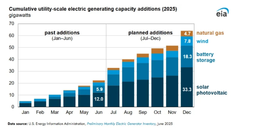 美國能源信息署(EIA)于2025年8月20日表示:“如果太陽能發(fā)電場和電池儲能系統(tǒng)的開發(fā)在2025年按預(yù)期推進(jìn),這兩種能源設(shè)施的新增容量都將超過以往任何一年。這種增長在很大程度上歸因于德克薩斯州發(fā)生的變化?!?