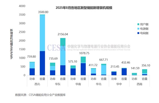 從區(qū)域分布來看,8月西北區(qū)域新增儲(chǔ)能裝機(jī)最大,為0.76GW/3.5GWh,功率規(guī)模占比26.78%,容量規(guī)模占比42.74%,雙雙位列全國第一,建設(shè)地點(diǎn)主要位于青海、新疆、甘肅,主要以電源側(cè)項(xiàng)目為主。