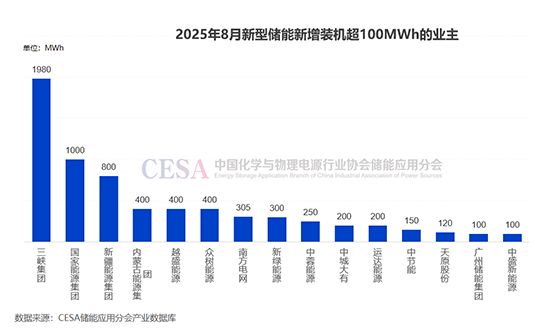 據(jù)CESA儲(chǔ)能應(yīng)用分會(huì)產(chǎn)業(yè)數(shù)據(jù)庫不完全統(tǒng)計(jì),8月三峽集團(tuán)和國家能源集團(tuán)新增裝機(jī)容量均為GWh級(jí)別。