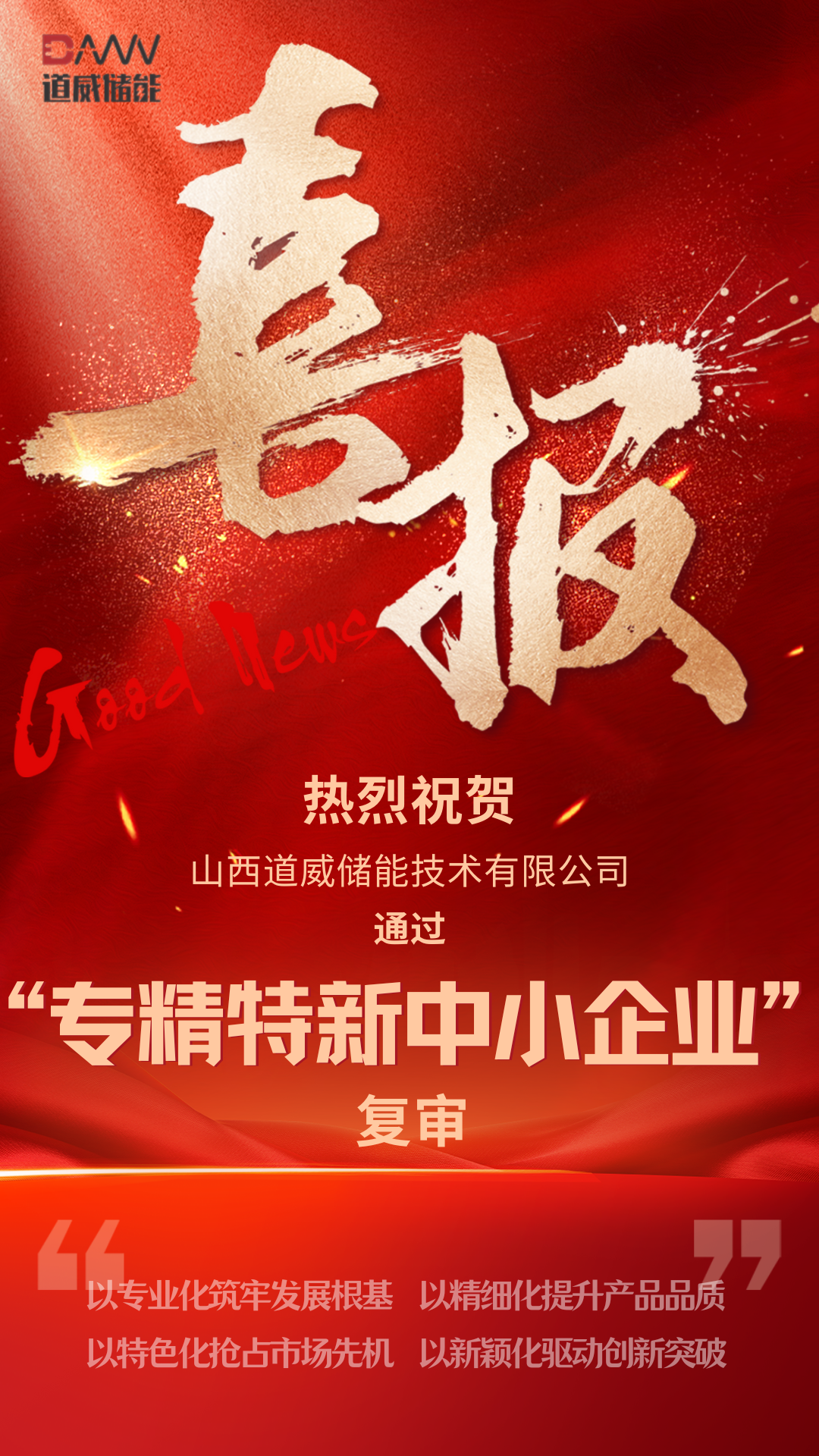 在山西省工業(yè)和信息化廳組織開展的 2025 年專精特新中小企業(yè)復(fù)審工作中,北京道威儲能集團(tuán)有限公司旗下全資子公司 —— 山西道威儲能技術(shù)有限公司,憑借扎實(shí)過硬的專業(yè)實(shí)力、亮眼突出的創(chuàng)新成果與穩(wěn)健向好的發(fā)展態(tài)勢,歷經(jīng)材料嚴(yán)苛審核、實(shí)地細(xì)致核查、專家綜合評審等多輪嚴(yán)格篩選,成功通過此次復(fù)審,繼續(xù)保有 “專精特新中小企業(yè)” 榮譽(yù)稱號!這既是對道威儲能發(fā)展成果的權(quán)威認(rèn)可,更是我省培育優(yōu)質(zhì)中小企業(yè)的生動實(shí)踐。