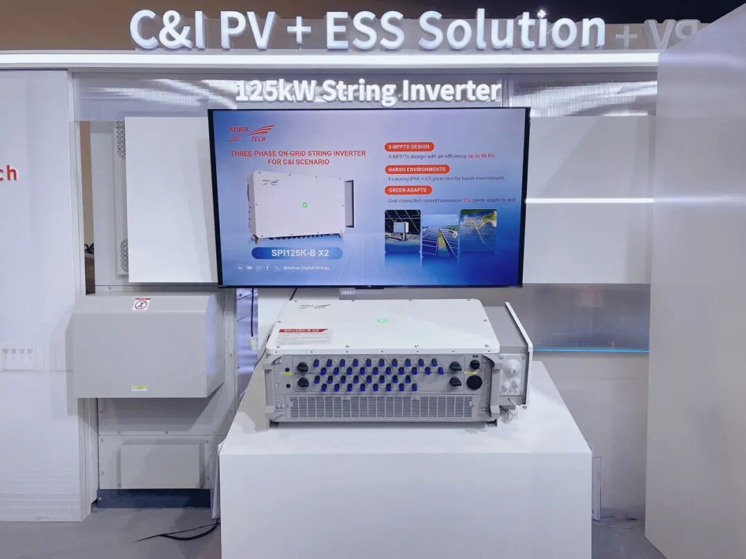 在光伏方面,科華數(shù)能本次重點展示了125kW組串式逆變器。該產(chǎn)品單路MPPT最高支持75A,配備直流/交流端子溫度智能監(jiān)測與自動化PV側停機功能,可選IV曲線分析與故障波形記錄,助力快速定位問題、預防維護。產(chǎn)品最高效率達98.8%,具備IP66+C5防護與低諧波并網(wǎng)表現(xiàn),可在寬溫環(huán)境下穩(wěn)定輸出。