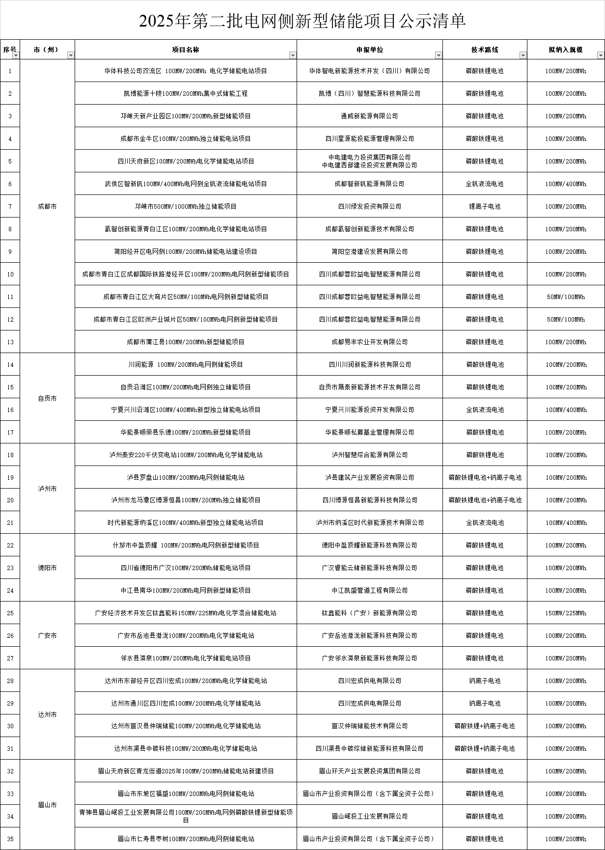 根據(jù)《關(guān)于開展2025年第二批電網(wǎng)側(cè)新型儲能項目申報工作的通知》要求,本次納入清單項目原則上在成都、自貢、瀘州、德陽、內(nèi)江、宜賓、廣安、達州8個迎峰度夏期間有電力缺口或局部供電卡口的區(qū)域,因眉山電網(wǎng)直接嵌入成都立體雙環(huán)網(wǎng),在該區(qū)域建設(shè)新型儲能項目能夠有效支撐成都電網(wǎng)安全穩(wěn)定運行,故一并納入。經(jīng)相關(guān)市推薦和專家評估論證,擬將“華體科技公司雙流區(qū)100MW/200MWh電化學(xué)儲能電站”等35個項目納入新型儲能項目清單,現(xiàn)予以公示。項目正式納入清單后,將按照市場化方式推動項目實施,相關(guān)市能源行業(yè)主管部門和電網(wǎng)企業(yè)做好協(xié)調(diào)保障工作。
