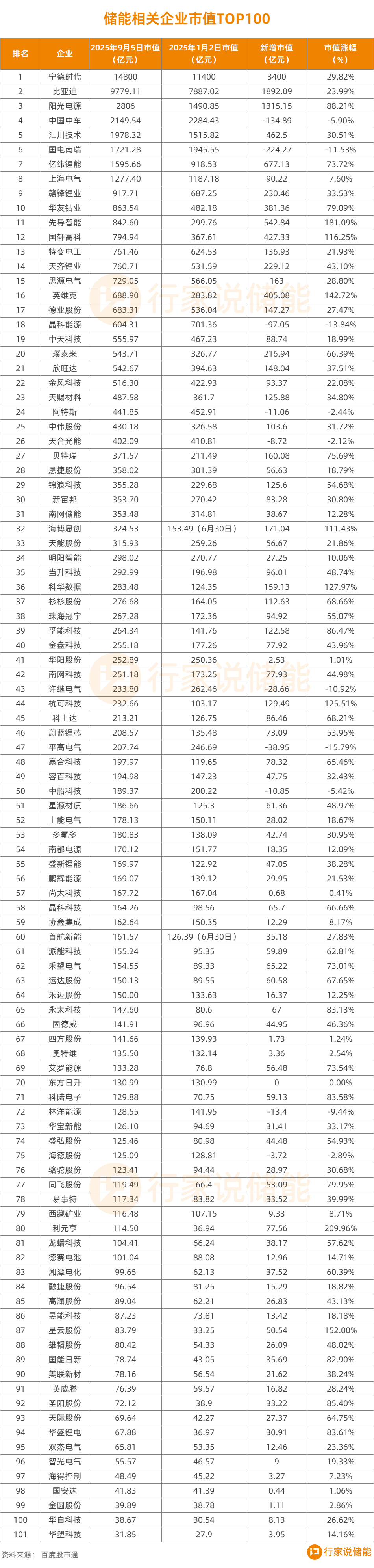 中國儲能網(wǎng)訊:據(jù)行家說儲能統(tǒng)計,儲能相關企業(yè)TOP100+總市值達60112億元。