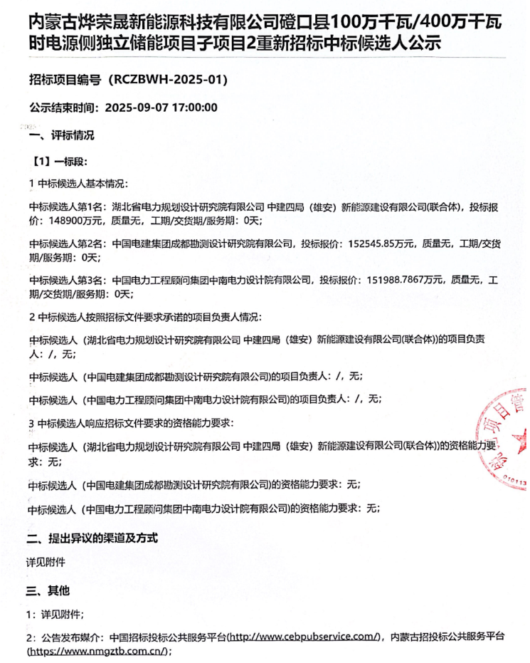 中國(guó)儲(chǔ)能網(wǎng)訊:9月5日,內(nèi)蒙古燁榮晟新能源科技有限公司磴口縣100萬(wàn)千瓦/400萬(wàn)千瓦時(shí)電源側(cè)獨(dú)立儲(chǔ)能項(xiàng)目子項(xiàng)目2重新招標(biāo)中標(biāo)候選人公示發(fā)布。