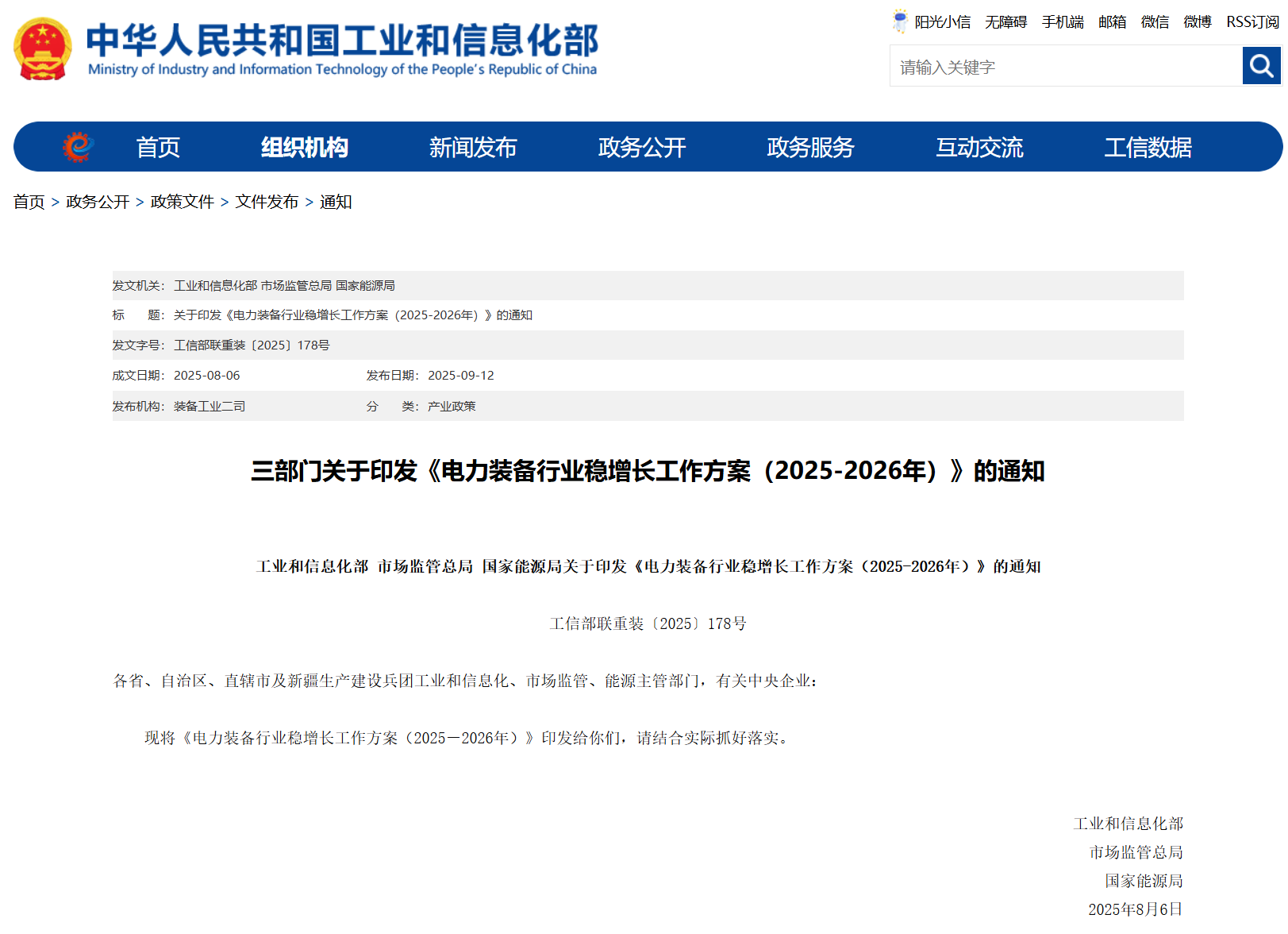 中國儲能網訊:9月12日,工業(yè)和信息化部、市場監(jiān)管總局、國家能源局聯(lián)合印發(fā)《電力裝備行業(yè)穩(wěn)增長工作方案(2025-2026年)》。
