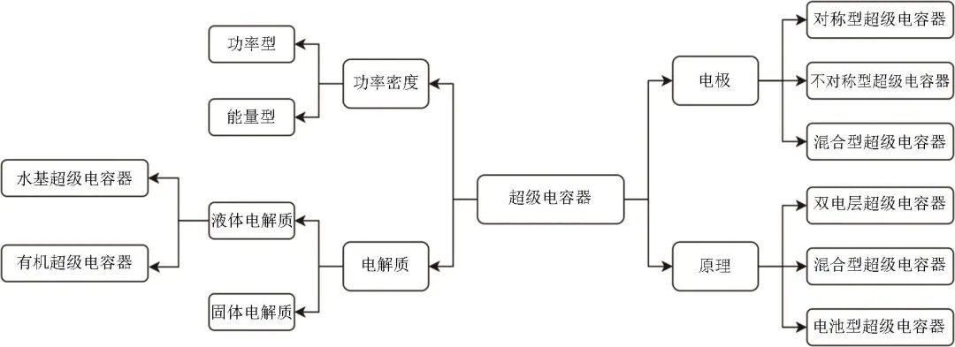 超級電容可根據(jù)電極、原理、電解質(zhì)、功率密度分類,如圖1所示。在超級電容研發(fā)中,一般通過原理將超級電容分為雙電層超級電容和混合型超級電容。