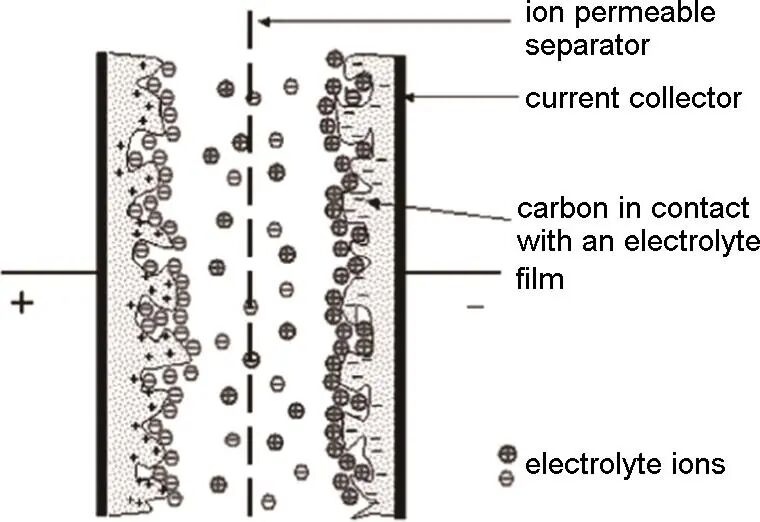雙電層超級電容(electric double-layer super capacitor, EDLC)是采用高比表面積材料作為電極主要材料,通過極化電解液形成雙電層來儲能的一類超級電容,無法拉第反應(yīng),在恒流充放電過程中其電壓與時間的關(guān)系曲線近似于線性,最低可放電至0 V。其在儲能原理上是高度可逆的,因此充放電壽命可達100萬次以上,日歷壽命可達15年以上,且可在大電流下實現(xiàn)快速充放電,其原理如圖2所示。
