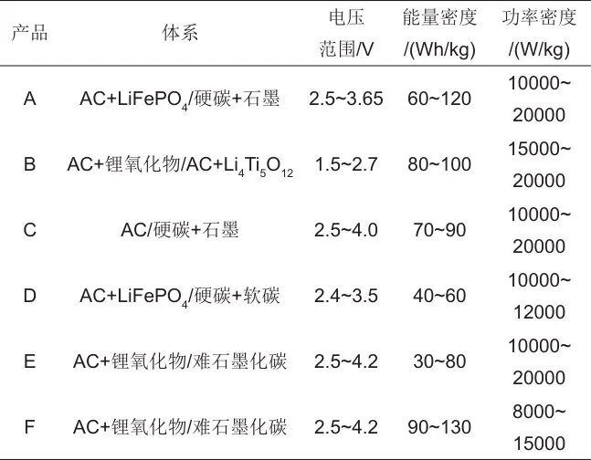 表2 已實現(xiàn)產(chǎn)業(yè)化應(yīng)用的混合型超級電容器主要參數(shù)