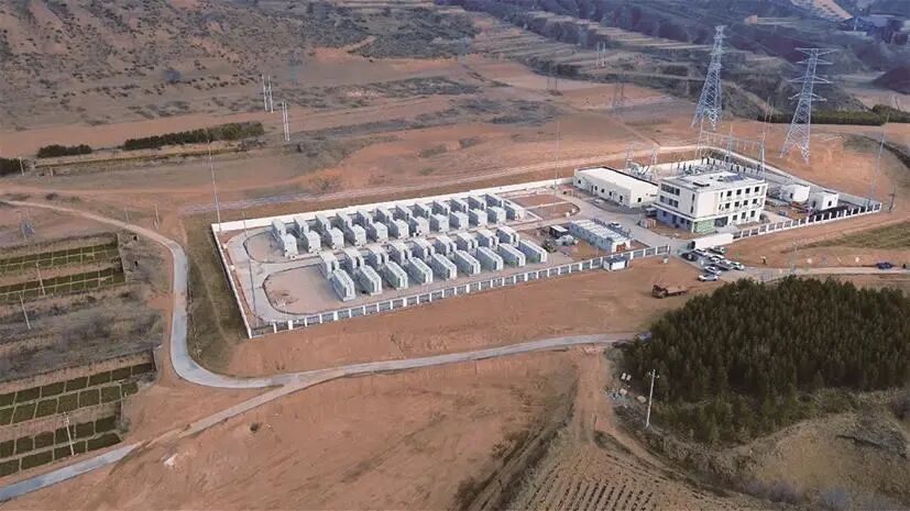 目前,我國已經(jīng)于山西省偏關(guān)縣建成了全球最大獨立調(diào)頻電站,整體采用58 MW/30 s超級電容系統(tǒng)+42 MW/42 MWh鋰電池系統(tǒng)組成,成功入選2025年4月國家發(fā)展改革委《綠色低碳先進技術(shù)示范項目清單(第二批)》名單。該項目通過快速響應(yīng)電網(wǎng)頻率波動,實現(xiàn)高頻次對電網(wǎng)小頻率波動的充分調(diào)節(jié),保持了電網(wǎng)的穩(wěn)定性,可為20倍于自身規(guī)模的新能源發(fā)電消納提供調(diào)頻支撐,項目現(xiàn)場如圖6所示。