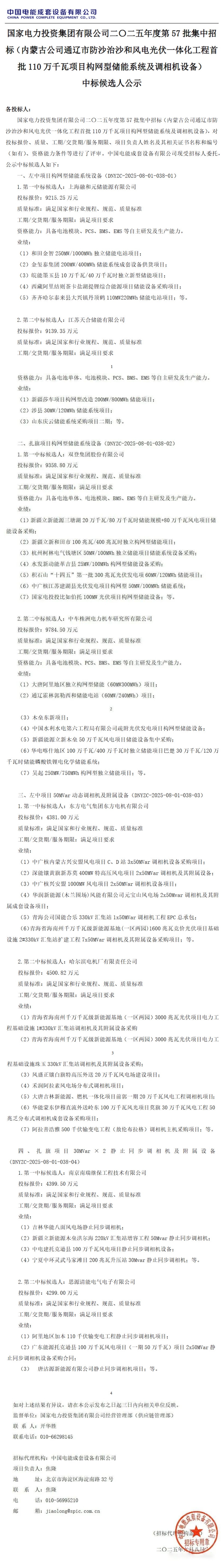 中國儲(chǔ)能網(wǎng)訊:近日,國家電力投資集團(tuán)有限公司二〇二五年度第57批集中招標(biāo)(內(nèi)蒙古公司通遼市防沙治沙和風(fēng)電光伏一體化工程首批110萬千瓦項(xiàng)目構(gòu)網(wǎng)型儲(chǔ)能系統(tǒng)及調(diào)相機(jī)設(shè)備)中標(biāo)候選人公示。其中包含左中項(xiàng)目構(gòu)網(wǎng)型儲(chǔ)能系統(tǒng)設(shè)備和扎旗項(xiàng)目構(gòu)網(wǎng)型儲(chǔ)能系統(tǒng)設(shè)備中標(biāo)候選人公示。