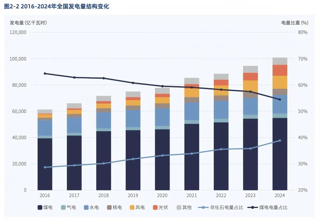在發(fā)電量方面,非化石能源發(fā)電量穩(wěn)步增長,但煤電仍是當(dāng)前中國電力供應(yīng)的主要電源。2024年,中國發(fā)電量10.09萬億千瓦時(shí)。其中,非化石能源發(fā)電量3.92萬億千瓦時(shí),占全口徑總發(fā)電量的比重為38.8%;風(fēng)電和光伏發(fā)電量二者合計(jì)占全口徑總發(fā)電量的18.1%。煤電機(jī)組以35.5%的裝機(jī)占比提供了54.8%的發(fā)電量,為5.5萬億千瓦時(shí),相比2016年煤電發(fā)電量占比(64.3%)下降9.5%。