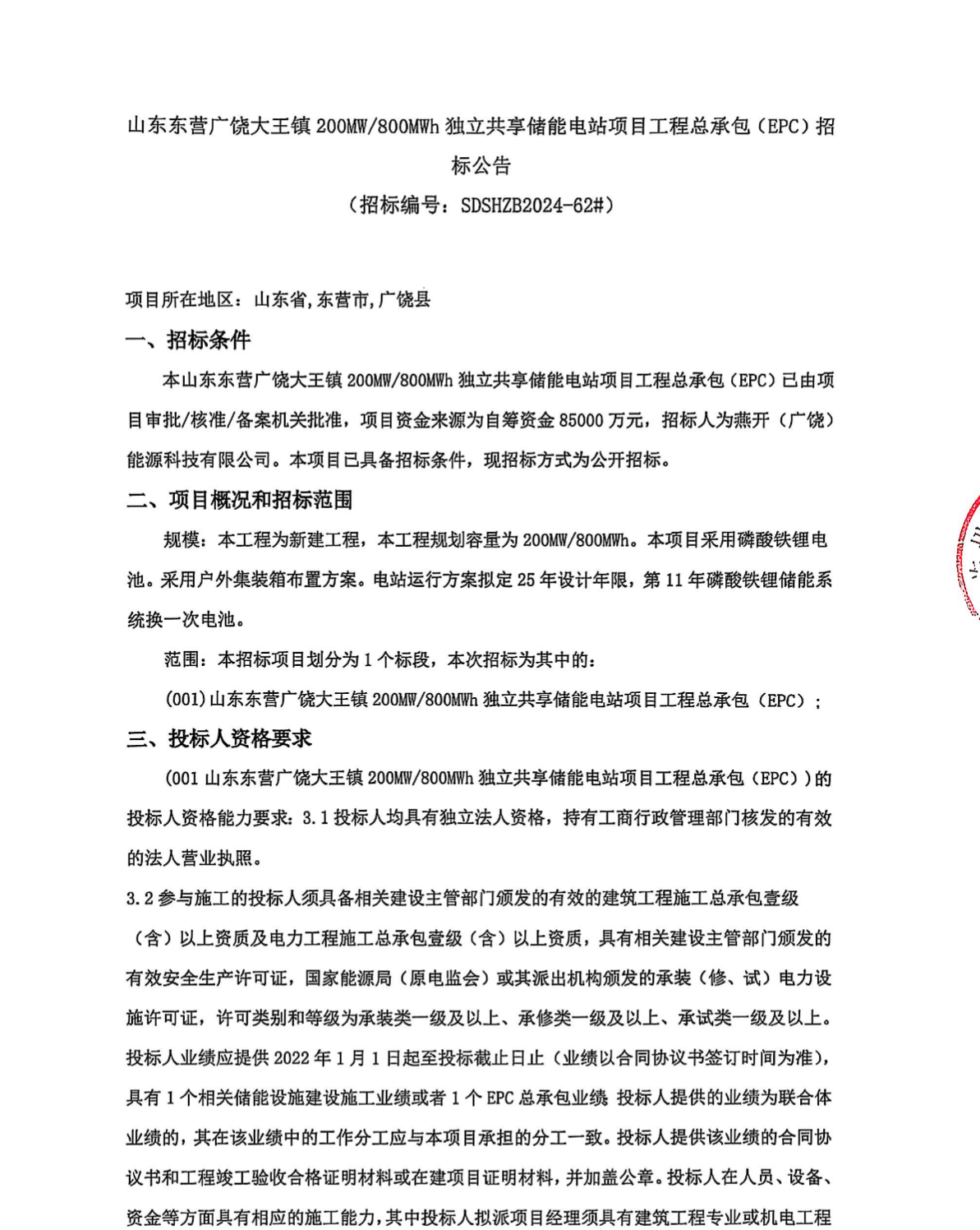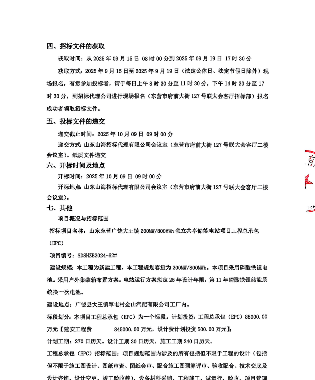 中國儲能網(wǎng)訊:9月12日,山東東營廣饒大王鎮(zhèn)200MW/800MWh獨(dú)立共享儲能電站項(xiàng)目工程總承包(EPC)招標(biāo)。