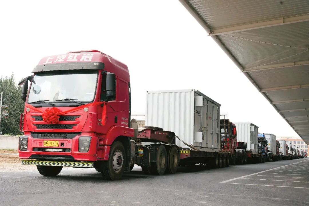 同一時(shí)刻,另一場(chǎng)“能源接力”也正在上演。河北科力遠(yuǎn)保定工廠啟動(dòng)了200MWh儲(chǔ)能系統(tǒng)產(chǎn)品交付工作。隨著指令下達(dá),起重機(jī)將大型儲(chǔ)能柜吊裝至重型卡車上。中午13點(diǎn)18分,在河北科力遠(yuǎn)總經(jīng)理賈文杰及公司員工的共同注視下,一輛輛滿載儲(chǔ)能柜的卡車組成“能源長(zhǎng)龍”,正式奔赴山東臨沂的羅莊獨(dú)立儲(chǔ)能電站項(xiàng)目。