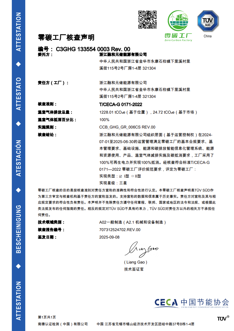 中國儲能網(wǎng)訊:在中國“雙碳”目標(biāo)擘畫出綠色發(fā)展新藍(lán)圖的時(shí)代背景下,融和元儲以“萬物共儲,和合共生”為使命,將可持續(xù)發(fā)展融入核心戰(zhàn)略。在該理念的指引下,近日,融和元儲永康智造基地成功通過國際權(quán)威認(rèn)證機(jī)構(gòu)TüV南德意志集團(tuán)(以下簡稱“TüV南德”)檢測,獲得“零碳工廠”認(rèn)證,成為融和元儲踐行綠色發(fā)展、邁向凈零排放目標(biāo)的典范。