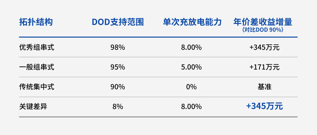 系統(tǒng)拓?fù)浣Y(jié)構(gòu)決定了電池簇的能量分配方式,合理的拓?fù)湓O(shè)計(jì)可避免簇間環(huán)流,避免局部電芯過充過放,從而支撐更高 DOD,例如:傳統(tǒng)集中式拓?fù)?,多簇直流并?lián),為避免充放電末端電池簇間環(huán)流導(dǎo)致的電池過充或過放問題,充放電范圍設(shè)置為5%~95%,DOD=90%; 而組串式拓?fù)洌瑔未貑喂芾?,?dú)立交流輸出,無簇間環(huán)流,配置合理的保護(hù)機(jī)制,DOD可以做到98%以上,并且不影響電池衰減。