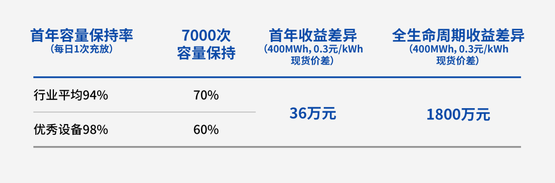 循環(huán)次數(shù):每增加 1000 次循環(huán),磷酸鐵鋰電池衰減率約 8%-12%(視溫度而定);而隨著循環(huán)次數(shù)的增加,不同衰減率的系統(tǒng)的可用容量差累積增加,導(dǎo)致優(yōu)的越優(yōu),差的越差,全生命周期的可充放電量差異大幅上升;所以,做好每一次充放電的衰減控制,是儲(chǔ)能系統(tǒng)長期高收益的有力保障。