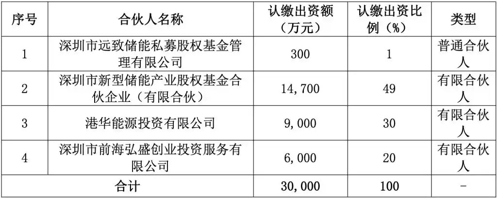 根據(jù)披露,該合伙企業(yè)認(rèn)繳出資總額為人民幣30000萬(wàn)元,其中有限合伙人前海弘盛認(rèn)繳出資額為人民幣6000萬(wàn)元,認(rèn)繳比例為20%;有限合伙人新型儲(chǔ)能認(rèn)繳出資額為人民幣14700萬(wàn)元,認(rèn)繳比例為49%;有限合伙人港華能源認(rèn)繳出資額為人民幣9000萬(wàn)元,認(rèn)繳比例為30%;普通合伙人遠(yuǎn)致儲(chǔ)能認(rèn)繳出資額為人民幣300萬(wàn)元,認(rèn)繳比例為1%。
