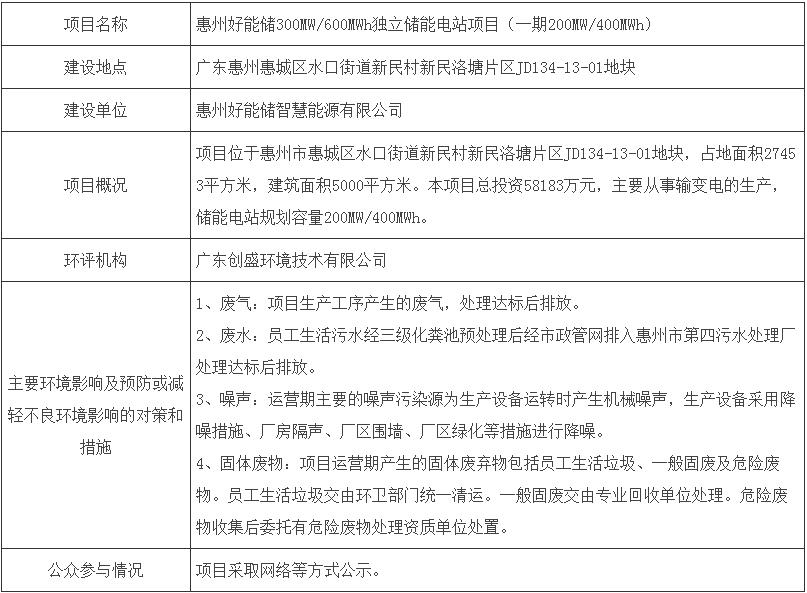 惠州市生態(tài)環(huán)境局惠城分局擬對惠州好能儲300MW/600MWh獨立儲能電站項目(一期200MW/400MWh)環(huán)境影響評價文件作出批準(zhǔn)決定的公示