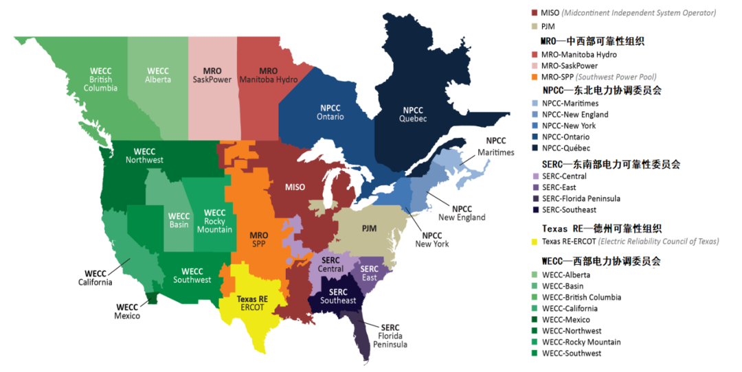 北美電力可靠性評估區(qū)域[2]是一張覆蓋六大核心區(qū)域的“電力安全網(wǎng)”,主要涵蓋北美電力可靠性協(xié)會(NERC)和六大區(qū)域?qū)嶓w(RE),包括中西部可靠性組織(MRO)、東北電力協(xié)調(diào)委員會(NPCC)、可靠性優(yōu)先組織(RF)[3]、東南部電力可靠性委員會(SERC)、德州可靠性組織(Texas RE)、西部電力協(xié)調(diào)委員會(WECC)所轄電力市場區(qū)域。相關(guān)區(qū)域相互聯(lián)動,共同構(gòu)成北美電力系統(tǒng)的“安全屏障”,其可靠性運(yùn)行情況直接關(guān)系到數(shù)千萬用戶的夏季用電體驗。