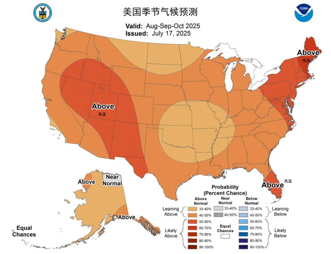 極端天氣多發(fā)、頻發(fā)、強(qiáng)發(fā)或?qū)﹄娏υO(shè)備可靠運(yùn)行和機(jī)組平穩(wěn)出力造成顯著影響。今年夏季期間,極端高溫大范圍蔓延,美國大部分地區(qū)夏季氣溫高于常年平均水平。其中,西部的內(nèi)華達(dá)州、猶他州和新墨西哥州大部地區(qū)、亞利桑那州東北部、俄勒岡州和愛達(dá)荷州南部,以及東北部的紐約州、賓夕法尼亞州、新澤西州、康涅狄格州大部地區(qū)將出現(xiàn)異常高溫的風(fēng)險(概率大于70%)。而緬因州、新罕布什爾州、馬薩諸塞州、佛蒙特州局地將出現(xiàn)歷史極端高溫的風(fēng)險(概率大于80%)。加拿大馬尼托巴省東北部、安大略省北部、紐芬蘭與拉布拉多省西部以及愛德華王子島省、新斯科舍省、新不倫瑞克省局地也將有極端高溫(概率超80%)。