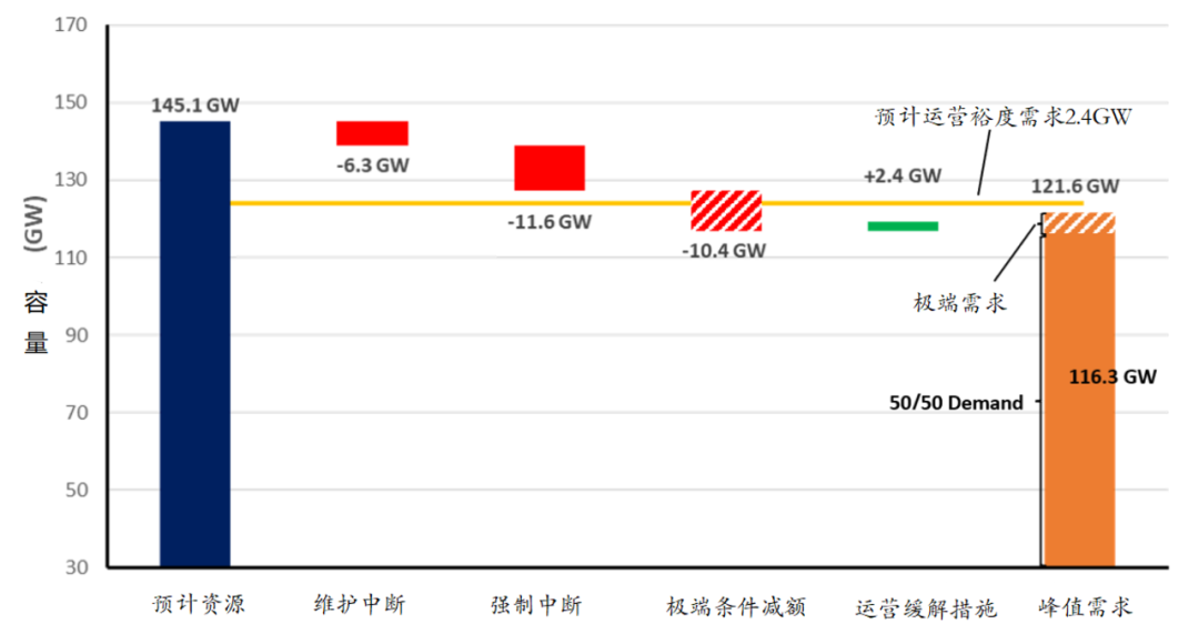 中西部可靠性組織-薩斯克電力公司(MRO-SaskPower):夏季期間,在正常情況下該區(qū)域電力市場不會出現(xiàn)容量限制或可靠性問題。然而,如果發(fā)電機(jī)組出現(xiàn)強(qiáng)制中斷(Forced Outages)[13]情況(中斷概率為21.5%,損失出力約35萬千瓦),同時疊加高于歷年均值水平的負(fù)荷需求,薩斯克電力公司需從鄰近區(qū)域電力市場短期購電,并啟動需求響應(yīng)、調(diào)整維護(hù)計劃以及采取臨時停電等措施,以彌補(bǔ)電力供應(yīng)缺口。