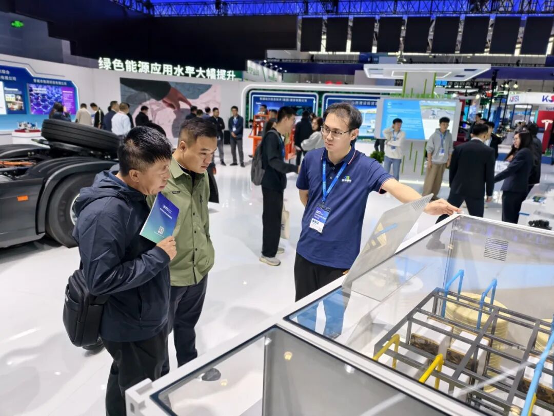 在主題形象展區(qū),國潤儲能重點展示了全釩液流電池儲能系統(tǒng)模型與電堆,闡釋其作為大規(guī)模、長時、高安全“能源銀行”的技術原理與應用價值。國潤的500KW模塊與高質(zhì)量集成交付能力,給現(xiàn)場觀眾及合作伙伴留下深刻印象。在能源科技創(chuàng)新展區(qū),公司集中呈現(xiàn)了在液流電池領域自主研發(fā)的核心材料成果,體現(xiàn)了從關鍵材料到系統(tǒng)集成的全鏈條技術實力。