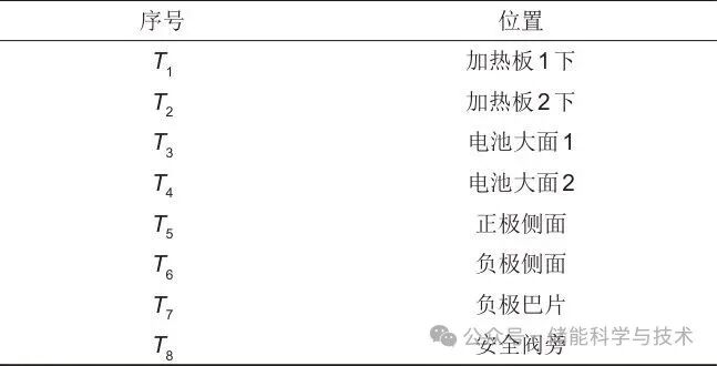 利用密閉壓力容器,對(duì)電池進(jìn)行加熱和過充觸發(fā)電池發(fā)生熱失控,壓力容器內(nèi)部空間為320 L。容器配套有抽真空系統(tǒng)、充氮系統(tǒng)、加熱系統(tǒng)和氣體采樣系統(tǒng),同時(shí)集成了壓力傳感器和多路熱電偶等數(shù)據(jù)采集系統(tǒng),用于測試實(shí)驗(yàn)過程中電池表面溫度、電壓和容器壓力。電池采用雙面加熱的方式,加熱板尺寸為140 mm×180 mm×2 mm,加熱板下方布置熱電偶,用于反饋加熱板的溫度,控制加熱的溫升速率。在加熱板與電池表面未覆蓋的位置中間布置熱電偶,用于測量電池兩個(gè)大面的溫度。同時(shí),在電池側(cè)面、負(fù)極、安全閥旁布置測溫點(diǎn),對(duì)比不同位置處的溫度差異。實(shí)驗(yàn)裝置及電池表面溫度測點(diǎn)如圖3、表3。