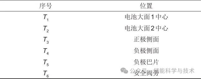 使用絕熱加速量熱儀研究電池在絕熱條件下的“自產(chǎn)熱-開閥-熱失控”過程。裝置設(shè)置最高溫度315 ℃,自產(chǎn)熱溫升速率檢測閾值為0.02 ℃/min,溫度步長為5.0 ℃。實(shí)驗(yàn)前,使用充放電循環(huán)儀對(duì)樣品電池進(jìn)行充放電,使得樣品電池在測試之前處于100%荷電狀態(tài)(state of charge,SOC)。電池表面布置熱電偶,用于記錄實(shí)驗(yàn)過程中電池表面的溫度變化,采用金屬夾板固定電池的兩個(gè)大面。實(shí)驗(yàn)裝置及電池表面溫度測點(diǎn)如圖2、表2。