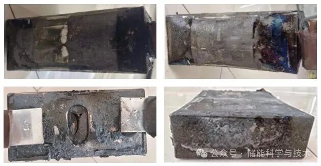 圖4給出了在絕熱條件下電池?zé)崾Э剡^程中表面溫度和溫升速率變化情況。絕熱環(huán)境下電池?zé)崾Э剡^程可以通過自產(chǎn)熱溫度(Tonset)、熱失控觸發(fā)溫度(Ttr)和熱失控最高溫度(Tmax) 3個(gè)特征溫度點(diǎn)劃分為3個(gè)階段。當(dāng)樣品電池表面溫升速率等于0.02 ℃/min時(shí),研究認(rèn)為電池內(nèi)部開始產(chǎn)熱,定義表面溫度為Tonset。從圖中可以得出,該電池的自產(chǎn)熱溫度Tonset為115.92 ℃。進(jìn)入自產(chǎn)熱階段,此階段中電池處于絕熱環(huán)境,ARC罐內(nèi)的溫度始終與電池溫度相同。當(dāng)溫度處于90~120 ℃時(shí),電池負(fù)極表面形成的鈍化SEI膜便開始熔化,導(dǎo)致電池負(fù)極與電解液發(fā)生反應(yīng),產(chǎn)生更多熱量。同時(shí)隨著溫度的不斷升高,電池材料內(nèi)部的化學(xué)反應(yīng)產(chǎn)生大量氣體,電解液隨溫度升高而蒸發(fā),導(dǎo)致電池內(nèi)部壓力升高。當(dāng)壓力達(dá)到電池安全閥的承載壓力上限時(shí),電池安全閥開啟。隨著電池的自熱反應(yīng)開始加速,電池中的隔膜在高溫下收縮,導(dǎo)致電池內(nèi)部發(fā)生短路。同時(shí),電解液分解并與電極材料發(fā)生反應(yīng),內(nèi)部短路和各種化學(xué)反應(yīng)產(chǎn)生大量熱量,溫度升高加速了內(nèi)部化學(xué)反應(yīng),造成了電池的升溫速率不斷增大。當(dāng)電池溫升速率超過3 ℃/s時(shí),認(rèn)為電池發(fā)生熱失控。從圖中可以得出,熱失控觸發(fā)溫度Ttr為201.30 ℃,最高溫度Tmax為444.82 ℃。電池在熱失控過程中的最高溫升速率為2353.08 ℃/min,對(duì)應(yīng)電池表面溫度為271.92 ℃。不同于磷酸鐵鋰電池,鈉離子電池在開閥后未發(fā)生明顯的溫度下降,且安全閥的開啟與熱失控觸發(fā)的時(shí)間非常接近。圖5為電池其他測點(diǎn)處溫度變化,正極側(cè)面、負(fù)極側(cè)面、負(fù)極巴片和安全閥旁的最高溫度分別為454.22 ℃、453.22 ℃、360.63 ℃和367.79 ℃。實(shí)驗(yàn)后的電池如圖6所示,測量電池質(zhì)量,得到電池質(zhì)量損失率為22.80%。
