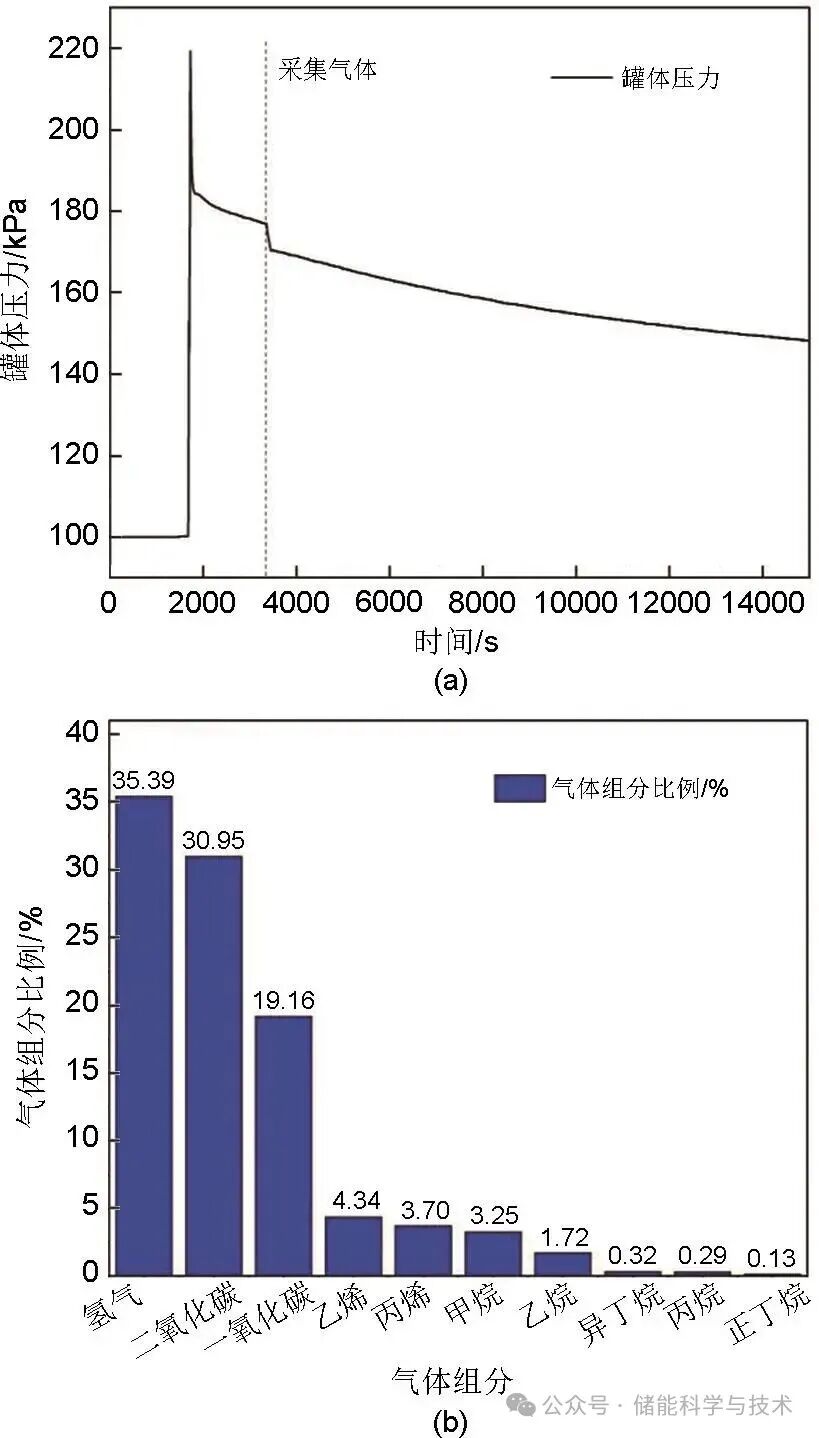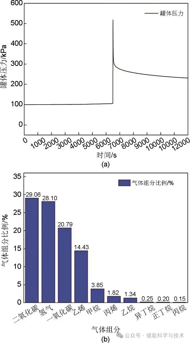 圖8   (a) 加熱條件下密閉容器內(nèi)壓力變化;(b) 電池?zé)崾Э蒯尫艢怏w各組分體積比