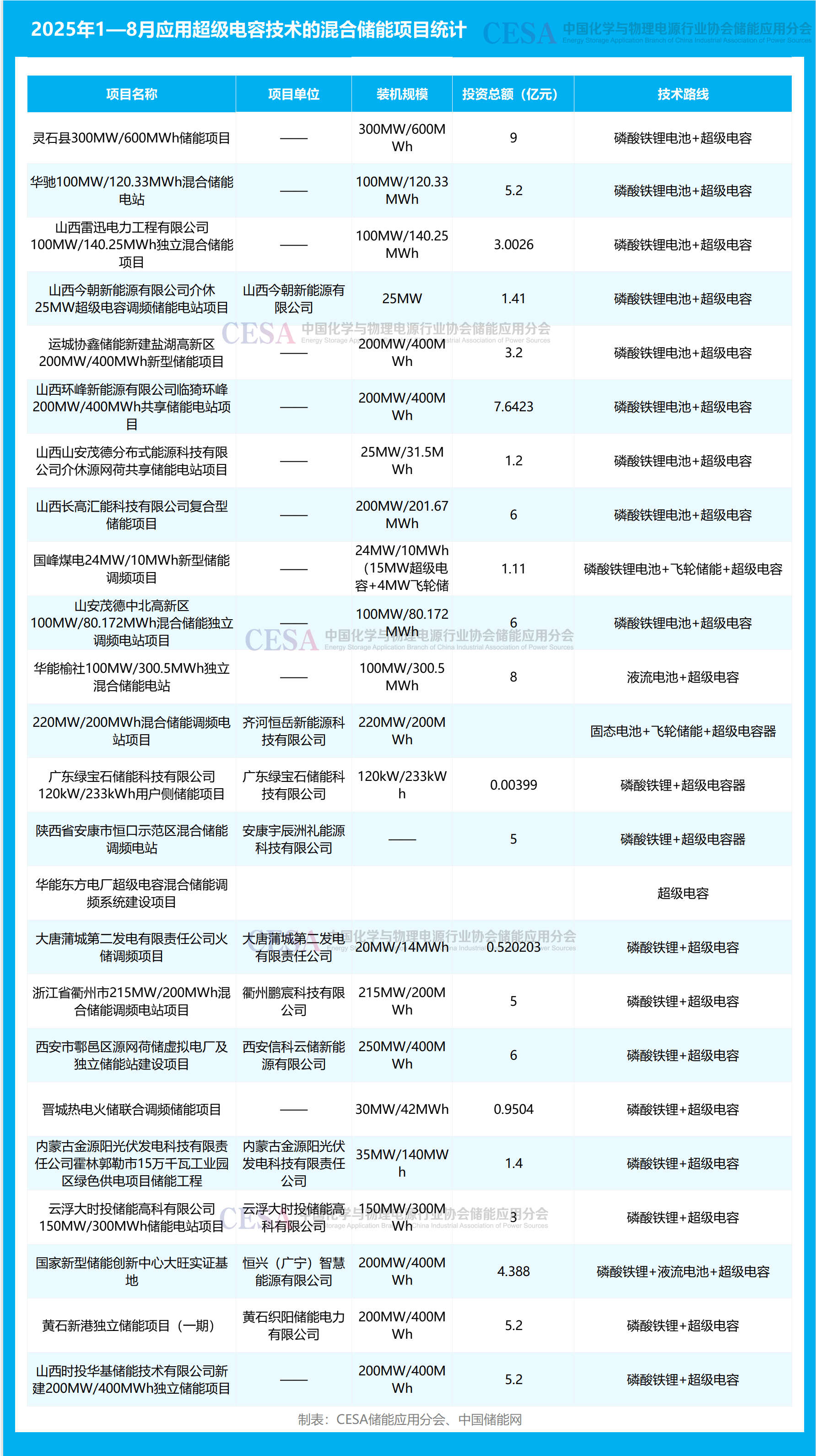 據(jù)CESA儲(chǔ)能應(yīng)用分會(huì)產(chǎn)業(yè)數(shù)據(jù)庫(kù)不完全統(tǒng)計(jì),僅2025年1—8月就有28個(gè)混合儲(chǔ)能項(xiàng)目中應(yīng)用了超級(jí)電容技術(shù),規(guī)模合計(jì)3639MW/6012.155MWh,總投資103.83億元。