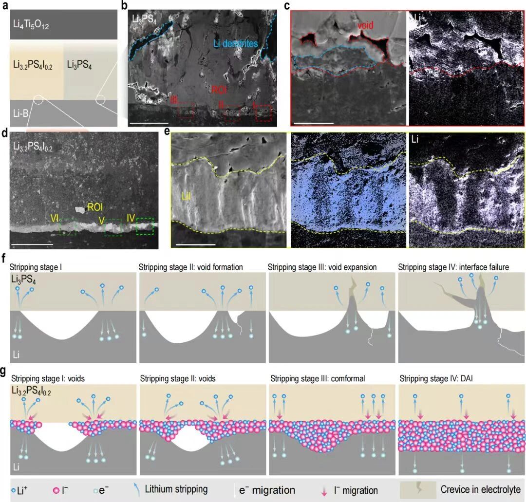 動態(tài)自適應(yīng)界面穩(wěn)定全固態(tài)鋰電池的機理研究。(a-e)處于剝離狀態(tài)下,Li–B|Li3PS4界面 (b, c) 和 Li–B|Li3.2PS4I0.2界面 (d, e) 的截面SEM圖像和AES元素面分布圖。比例尺為50 μm (b, d) 和10 μm (c, e)。(f)傳統(tǒng)無動態(tài)自適應(yīng)界面電池界面失效過程示意圖。(g)動態(tài)自適應(yīng)界面改善全固態(tài)鋰電池循環(huán)性能的工作機理示意圖。